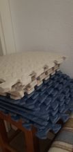 I like this and will repurchase. I placed it in the laundry room, and it's more fluffy than I thought with good quality. The winter ones were a bit slippery, but this one is still okay. I plan to repurchase for the veranda use. I couldn't take a picture, so you can report to my family's idiots.
