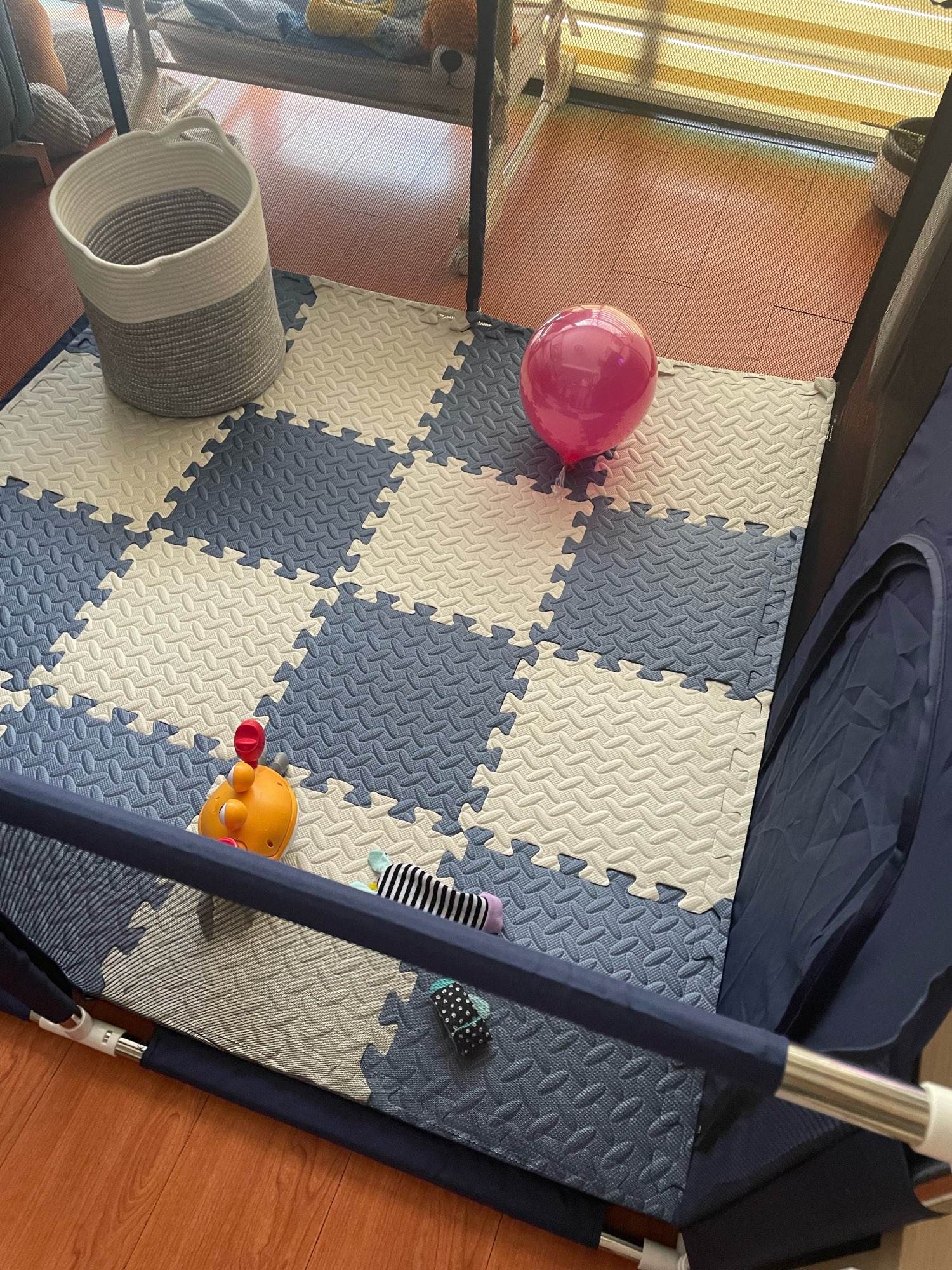 Mat of the right thickness, I bought it to put under my daughter's playpen. Very soft and easy to arrange. Nice color. As described
