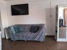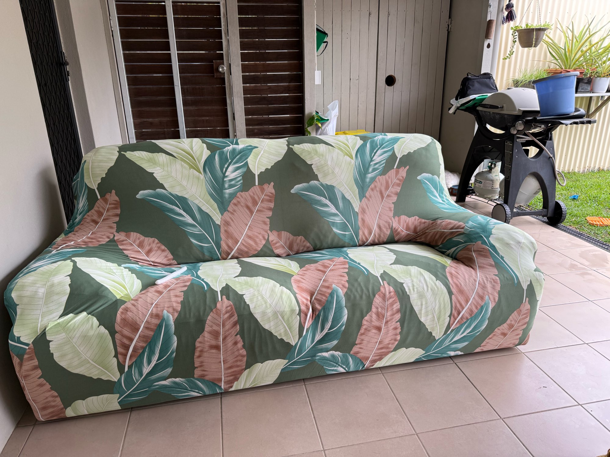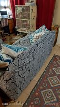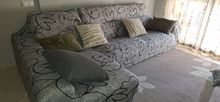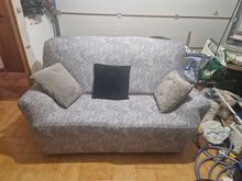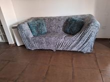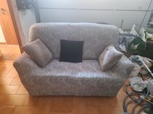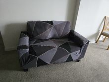 Fits well on a sofa with a width of 180cm. You need to position the seams well on the sides and then pull the whole thing together. And then the circles between the back and the seat. The fabric is rather thin but seems durable.