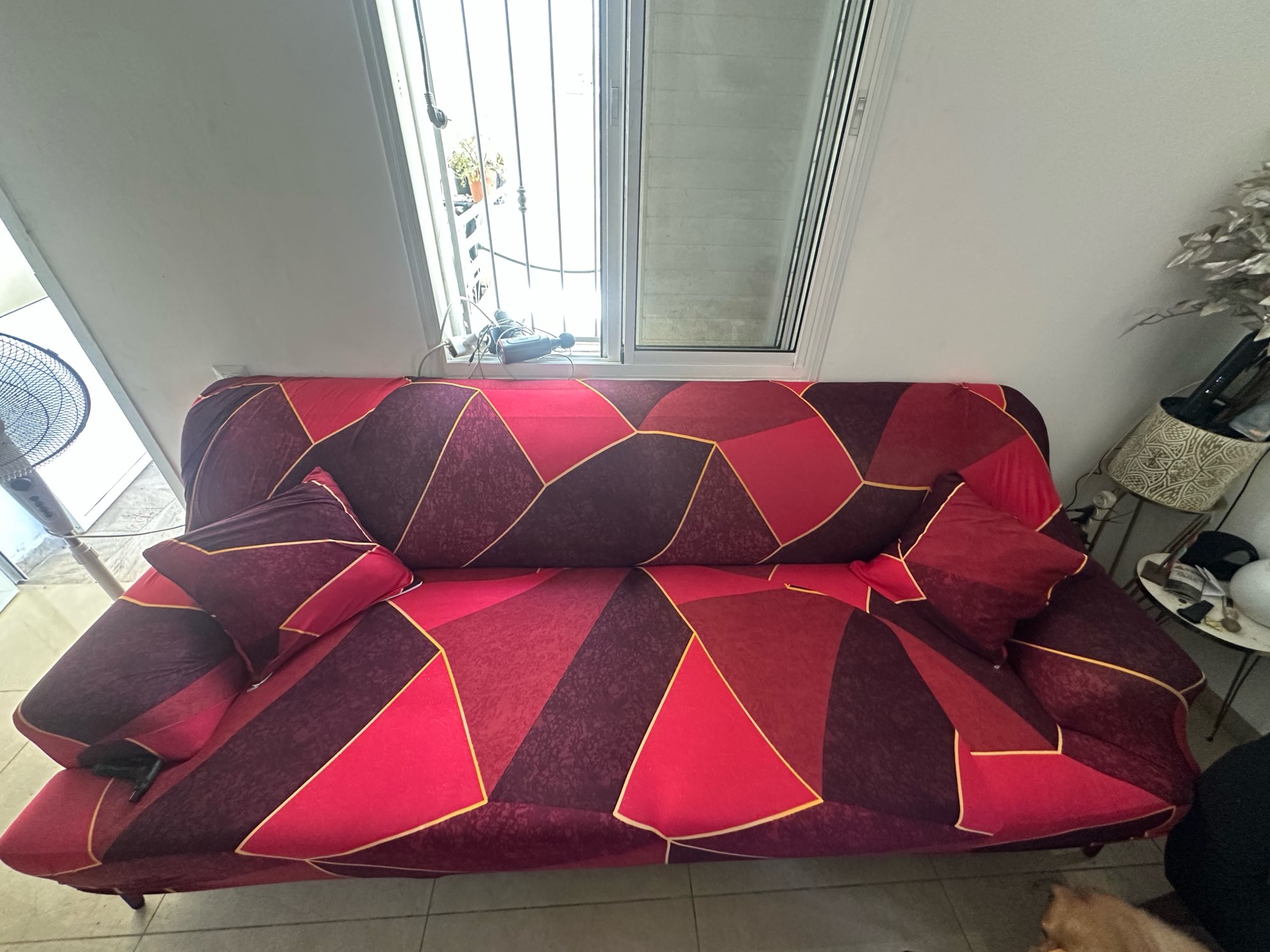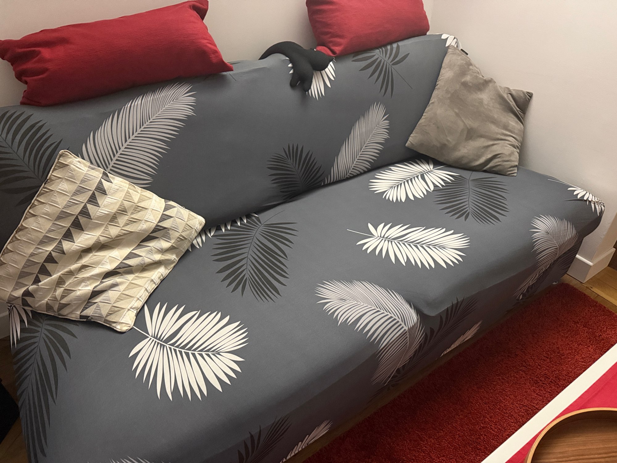The fabric cover is simple but enough to prevent the cats from tearing the leather of the sofa. Due to the price I got, it is highly recommended. The previous one was this reversible garbage that is not worth anything, and I bought it even more expensive. Photos 1 and 2 are the purchase. The third one is the reversible one.