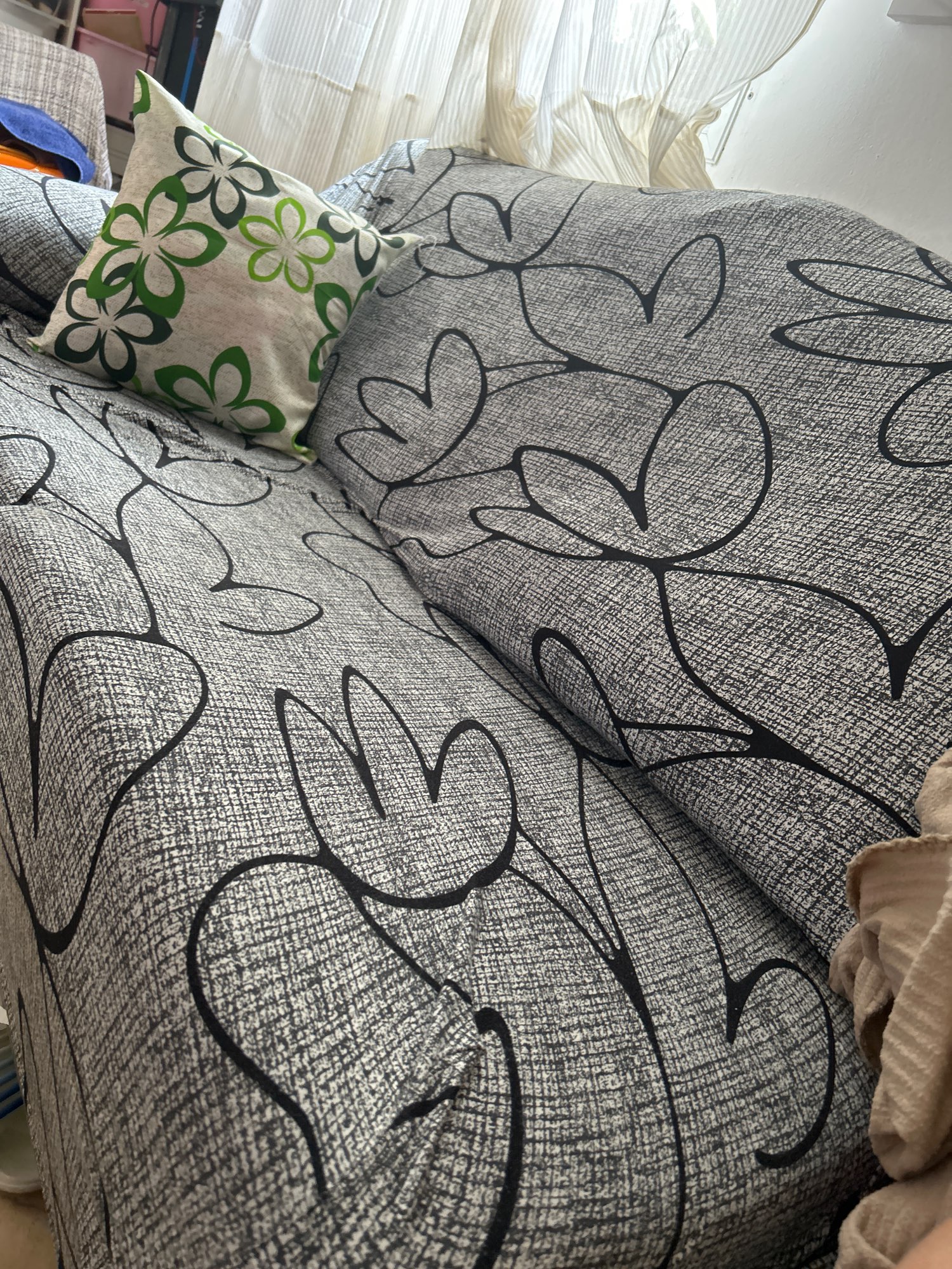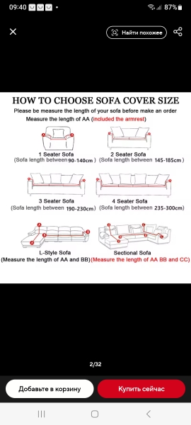 Just received it. I tried it on and really liked it. Completely blocked the old обид. It must be taken into account that if the sofa is two-seater, but the handles are wide, you need to take a three-seater cover for a comfortable fit. Otherwise, it will be very tight and will not fit beautifully on all curves. I specifically showed a photo of the measurement sample. Respect to the seller.