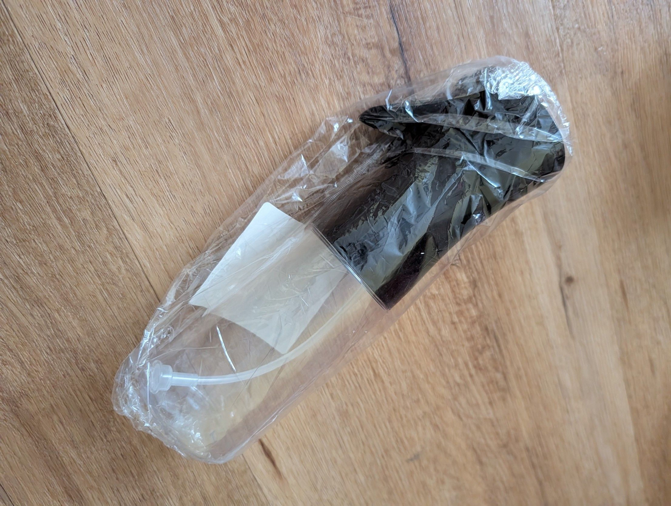 The order arrived quickly, in a combined package. It looks okay to me... the top (black part) is made of plastic, very shiny, the bottom part (light part) is made of soft material, like polyethylene... sprays forward with an even stream but lays on the surface in the form of a horizontal stripe 25 cm long and approximately 1 cm wide