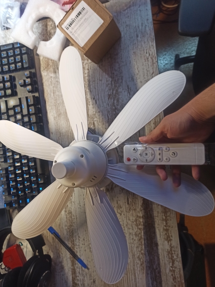 It is very practical and useful, it has 3 modes of white and yellow light and the brightness can be adjusted, it has a night mode, 3 fan speeds that blow very good air and it is very quiet, and everything can be managed with its remote control which uses 2 AAA batteries not included.