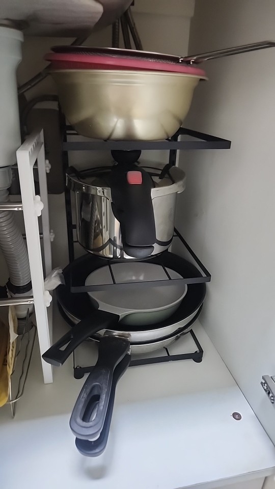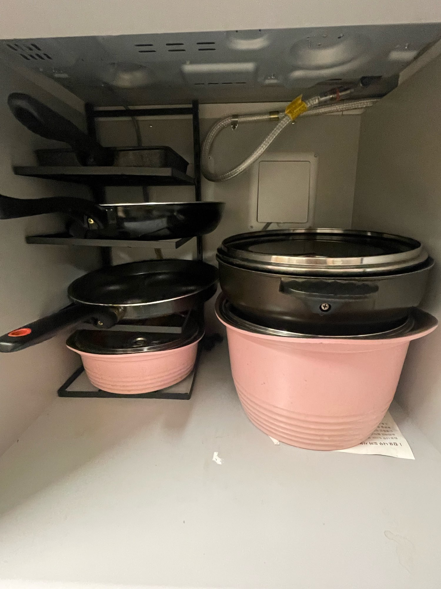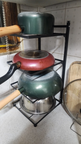 I needed a narrow organizer that could hold pots and pans, and this is perfect. The one in my studio apartment is very small, so I bought a 3-tier organizer, but I think a 4-tier one would have been fine too.