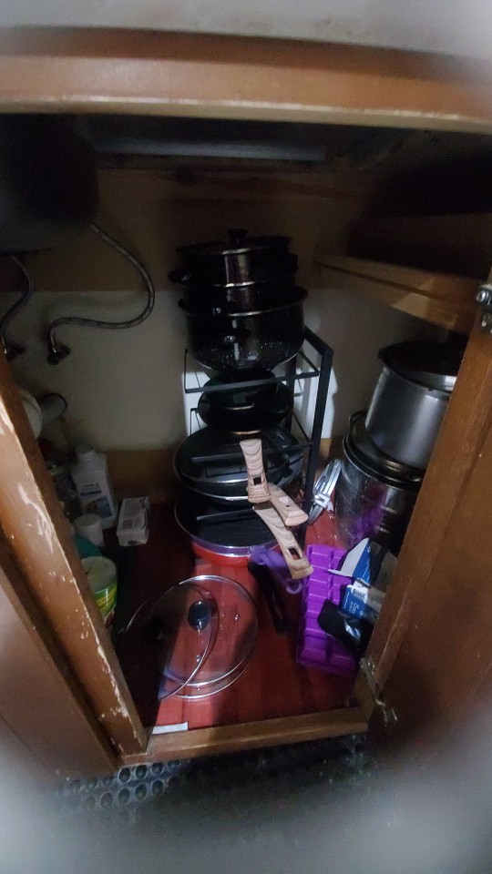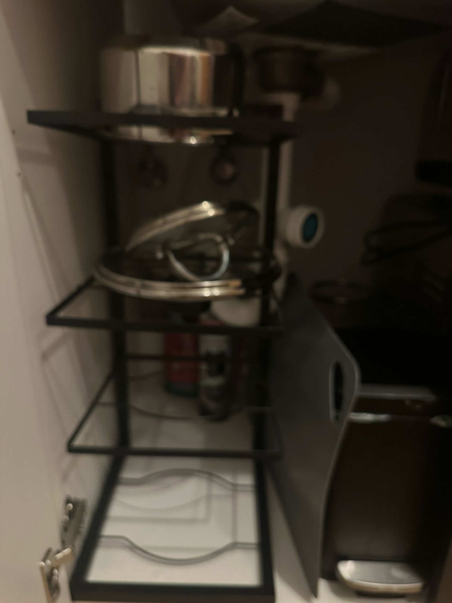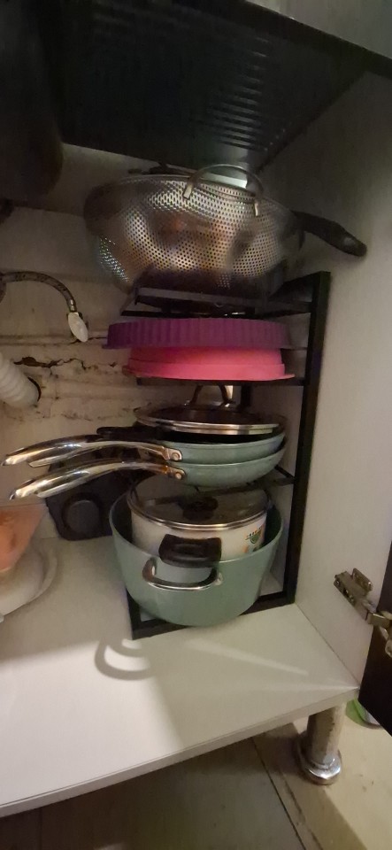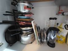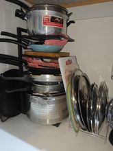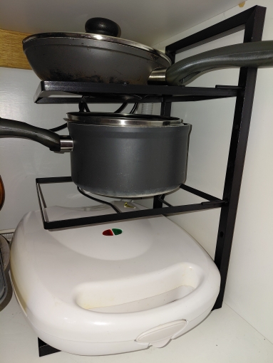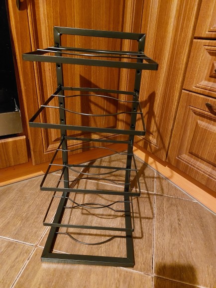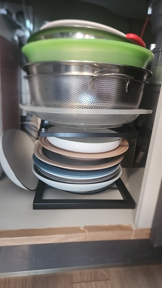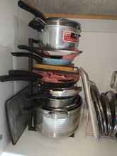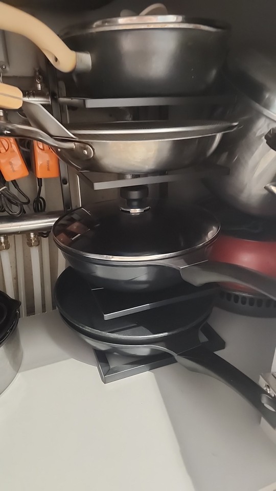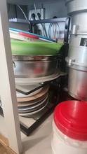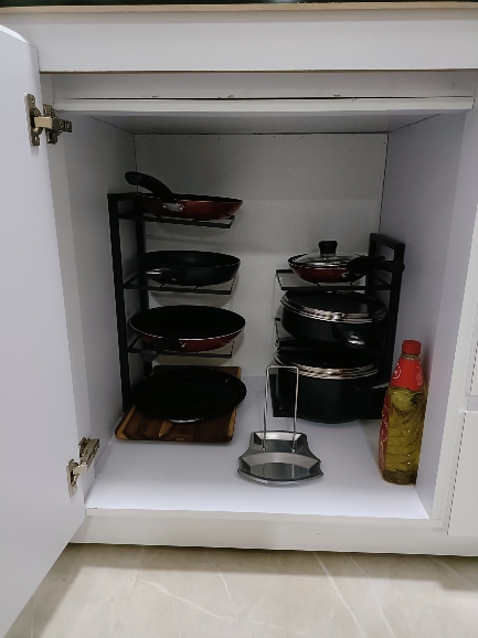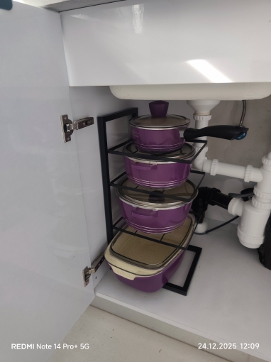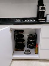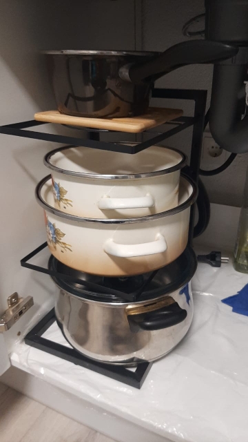 Looks good and convenient, no need to climb into the cabinet to pull out some pan if it's far away; everything is within reach. Opened the door, took it, will order another one from the other side because there wasn't enough space for all the pans.