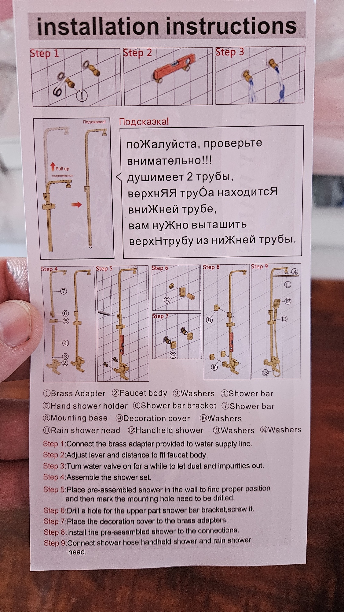 The product was delivered on time, a complete installation kit, super quality, brass and stainless steel. In the store it costs 15000 rubles the same The technician quickly assembled and installed, all modes work perfectly, touch-up pleasant. I recommend the seller