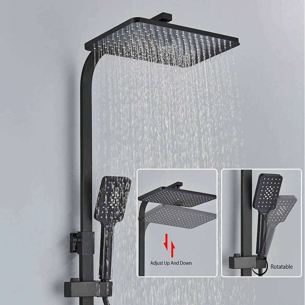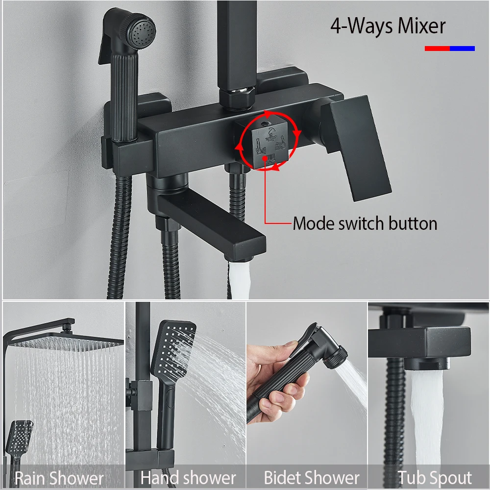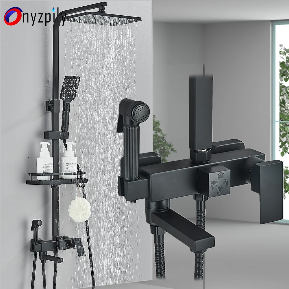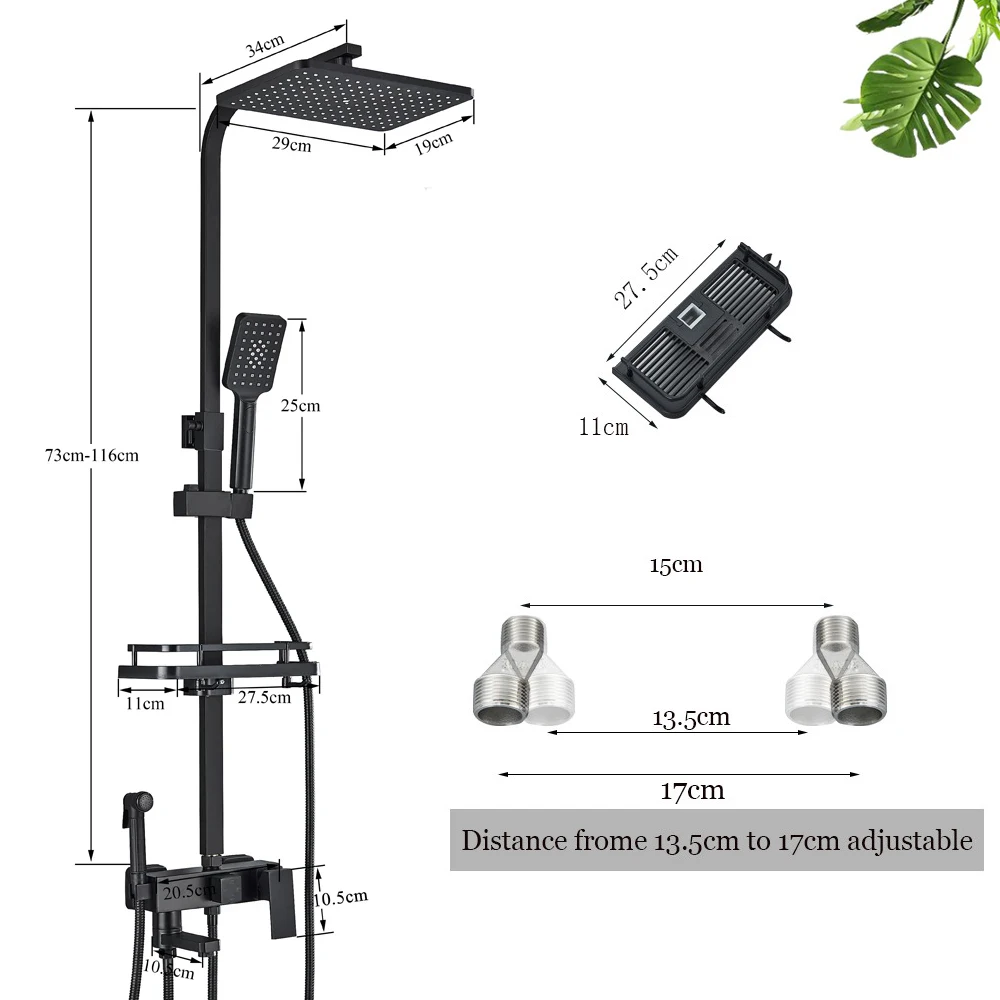 Black Shower Faucet Set Rainfall 3/4-way Bathtub Tap With Bathroom Shelf Height Adjust Shower Mixer CraneHot Cold Water Mixer Bidet Faucet