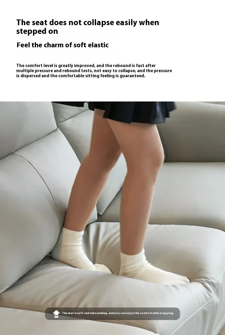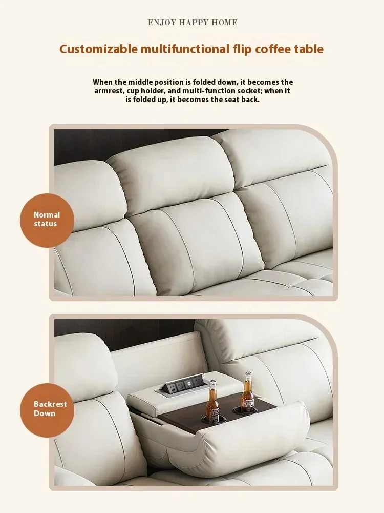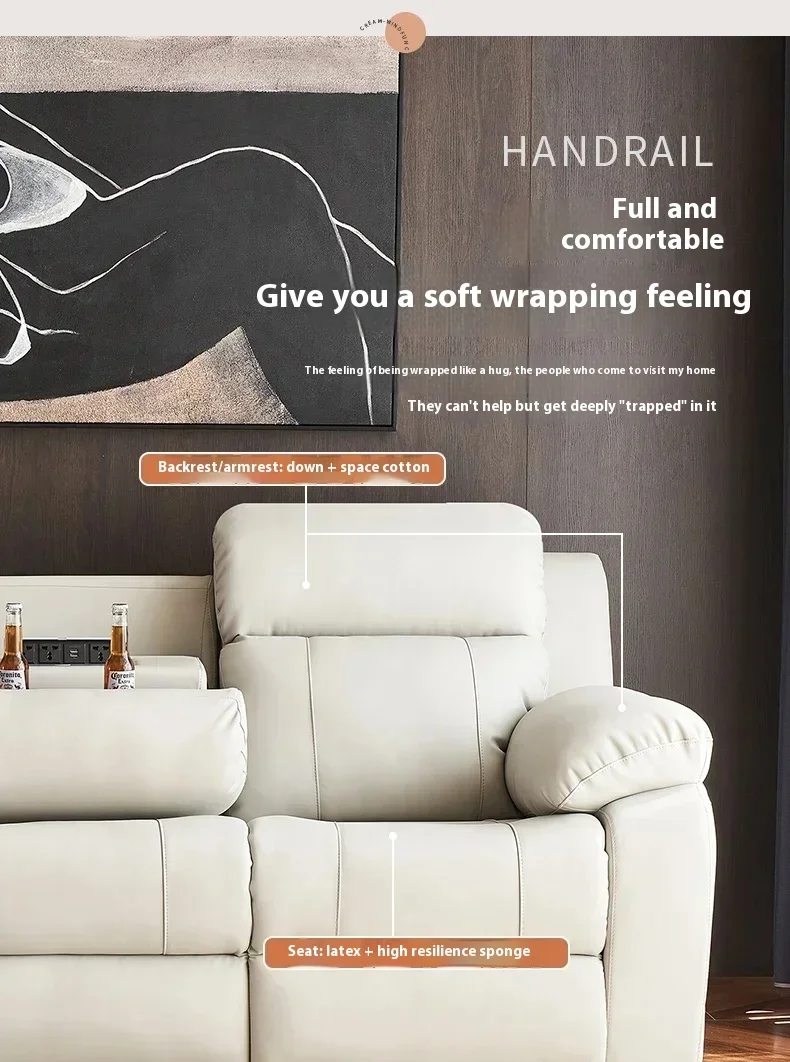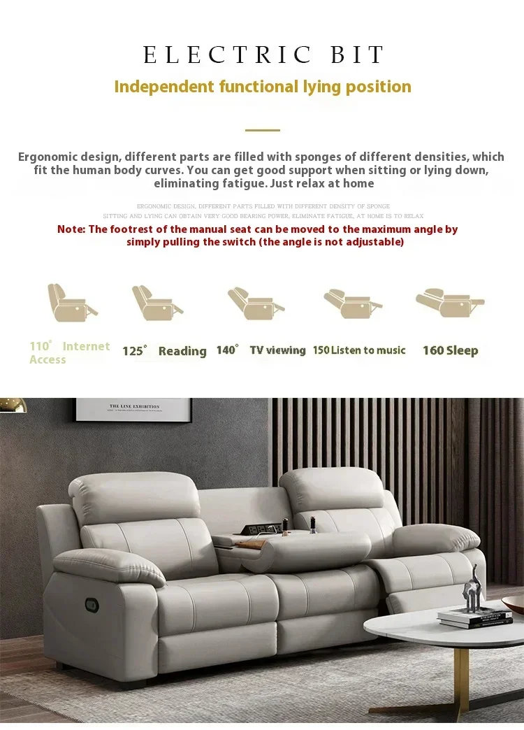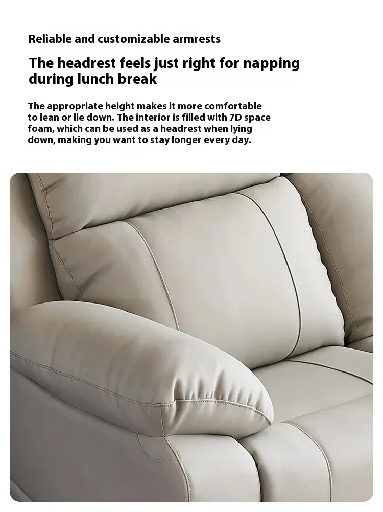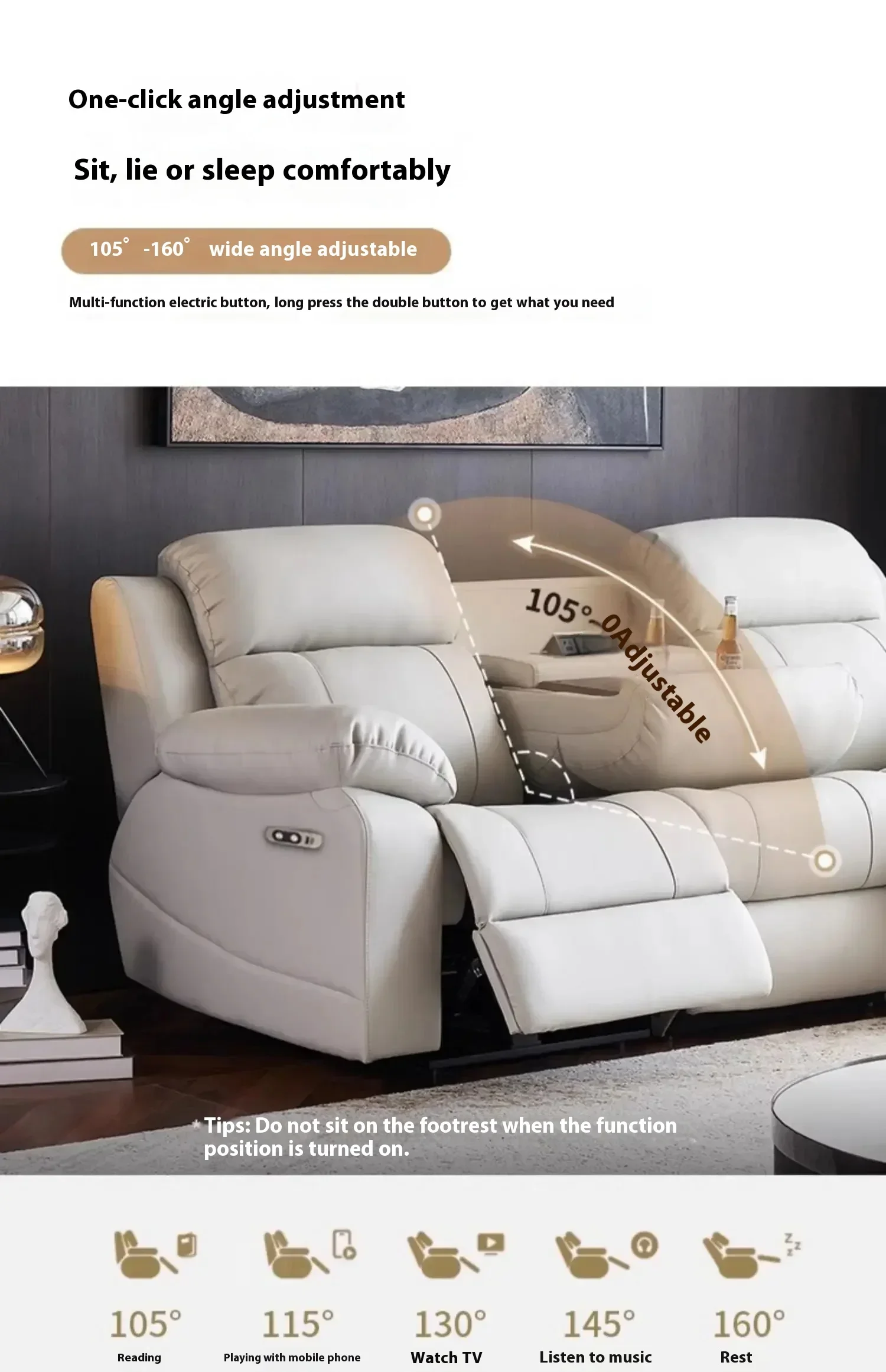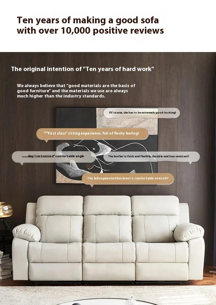 The genuine leather sofa is super comfortable, and the electric adjustment feature is very convenient. The small space used to create a movie theater for two people is simply fantastic!