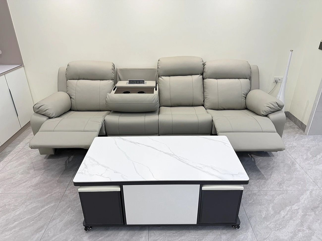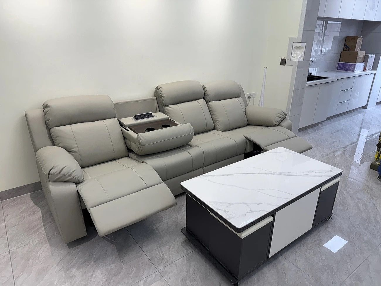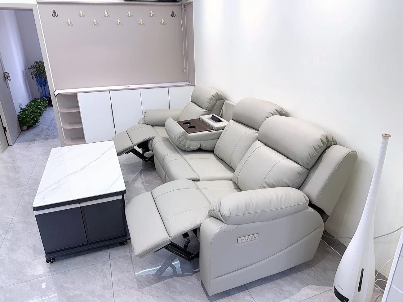 The genuine leather sofa is super comfortable, and the electric adjustment feature is very convenient. The small space used to create a movie theater for two people is simply fantastic!