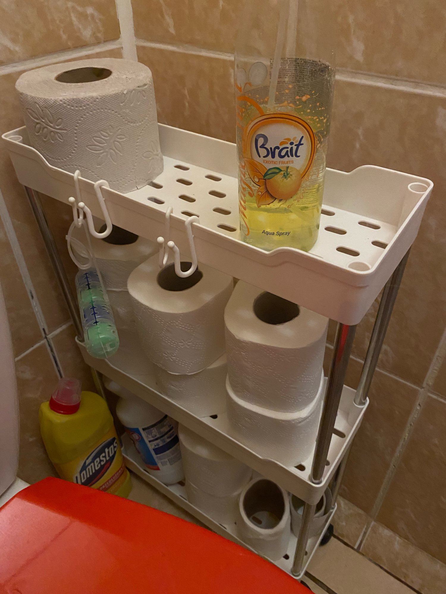 The product arrived on time! Well packaged! The shelf is easy to assemble. I placed it in the bathroom! Unfortunately, Domestos doesn't fit on the shelf! Thanks to the seller!