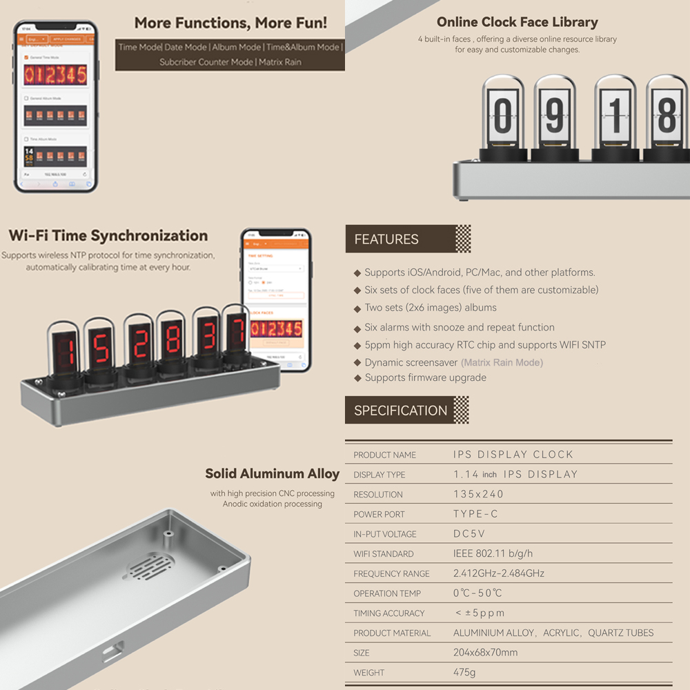 > Material: Solid Aluminum Alloy Base, IPS Screen, Glass Tube