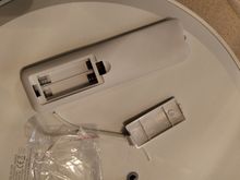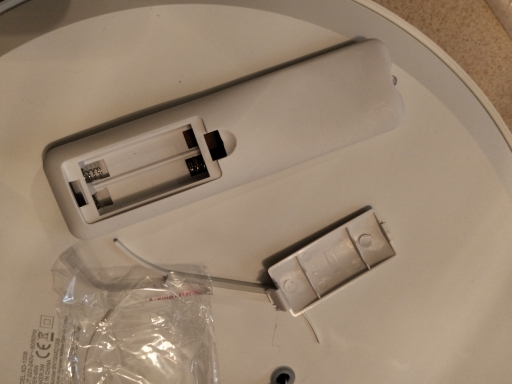 It's made of plastic, it weighs nothing. Very easy to install. The remote control does not come with batteries; the ones it uses are the smallest ones. It has many light settings and colors... I love it.