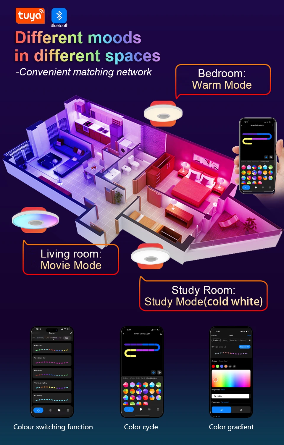 2. Intelligent dual control: can be remotely controlled through the TUYA APP, and can easily adjust lighting modes, brightness, color temperature, etc; It can also be operated with a matching remote control to make lighting control simpler.