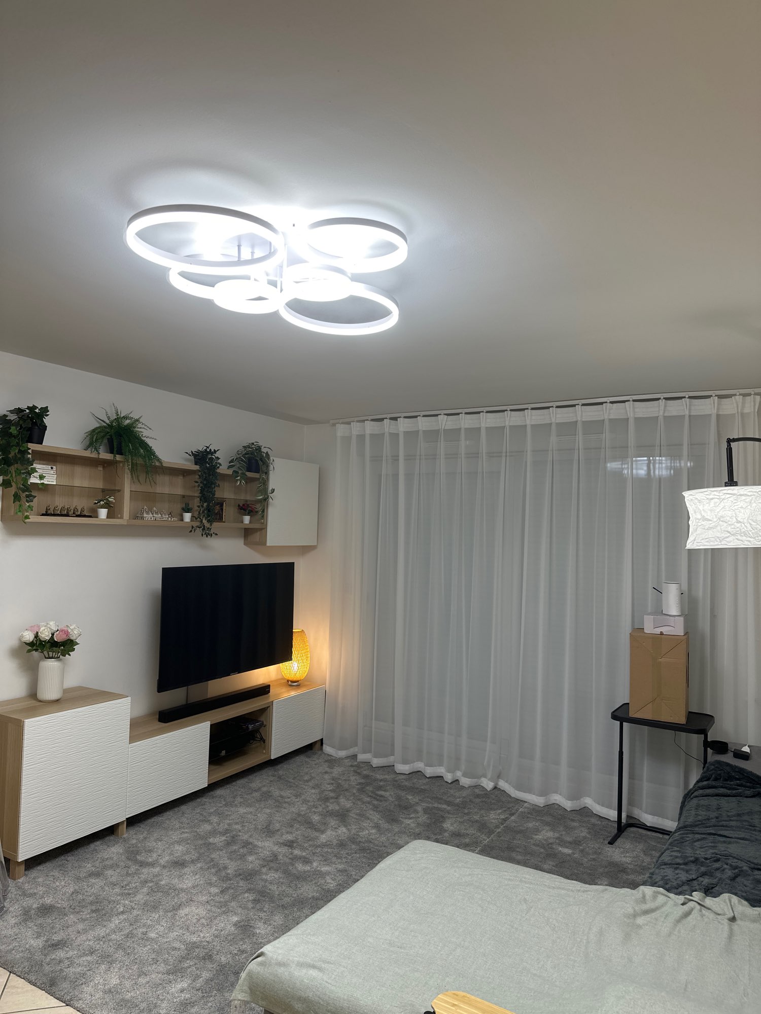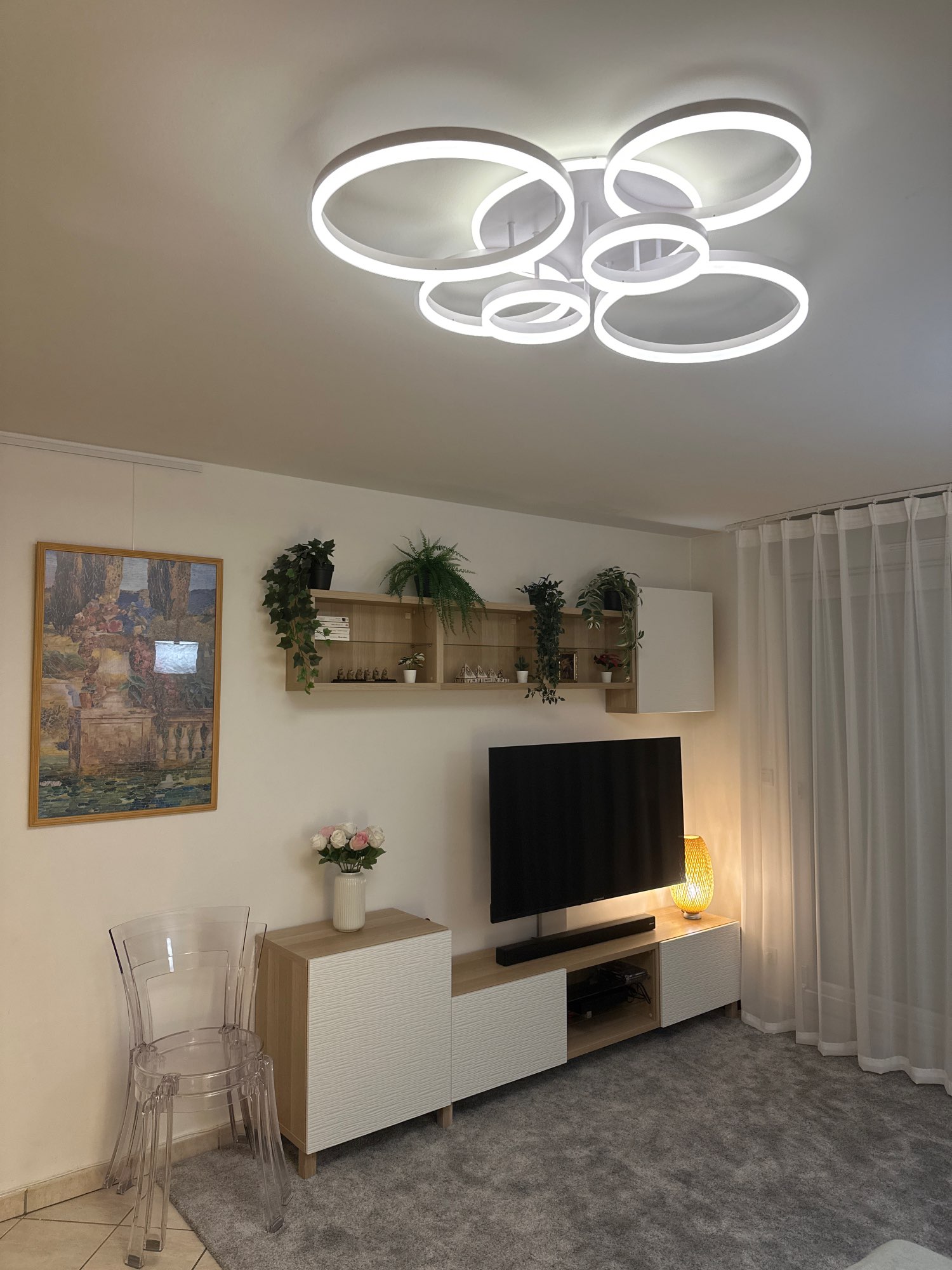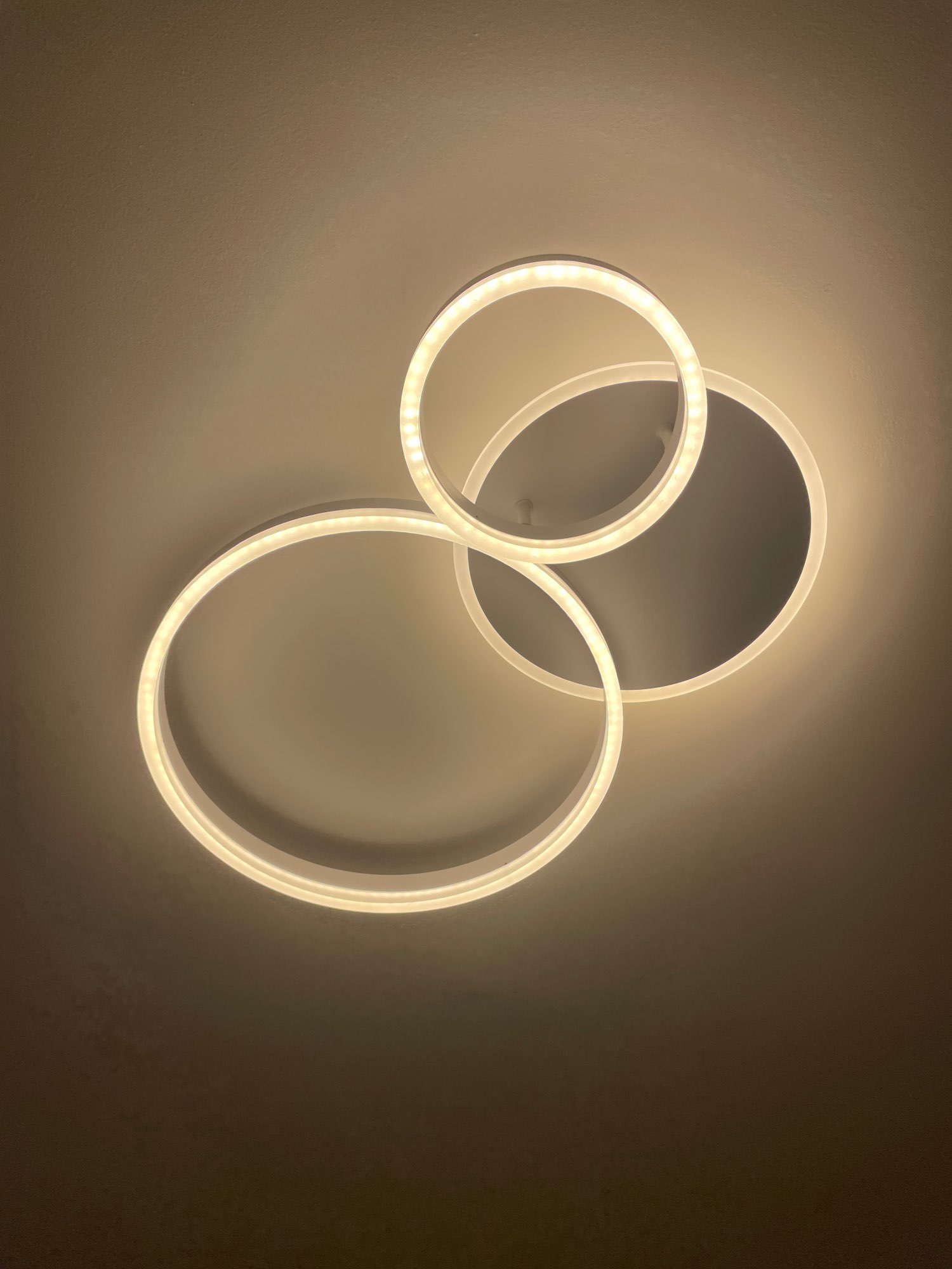 Chandelier 115cm. No assembly instructions, however, the connections are very intuitive. A large circle, in my opinion, should still be attached somehow, because it slightly sticks out. Overall the lamp is mega! You can set the color tone and lightening. I recommend!