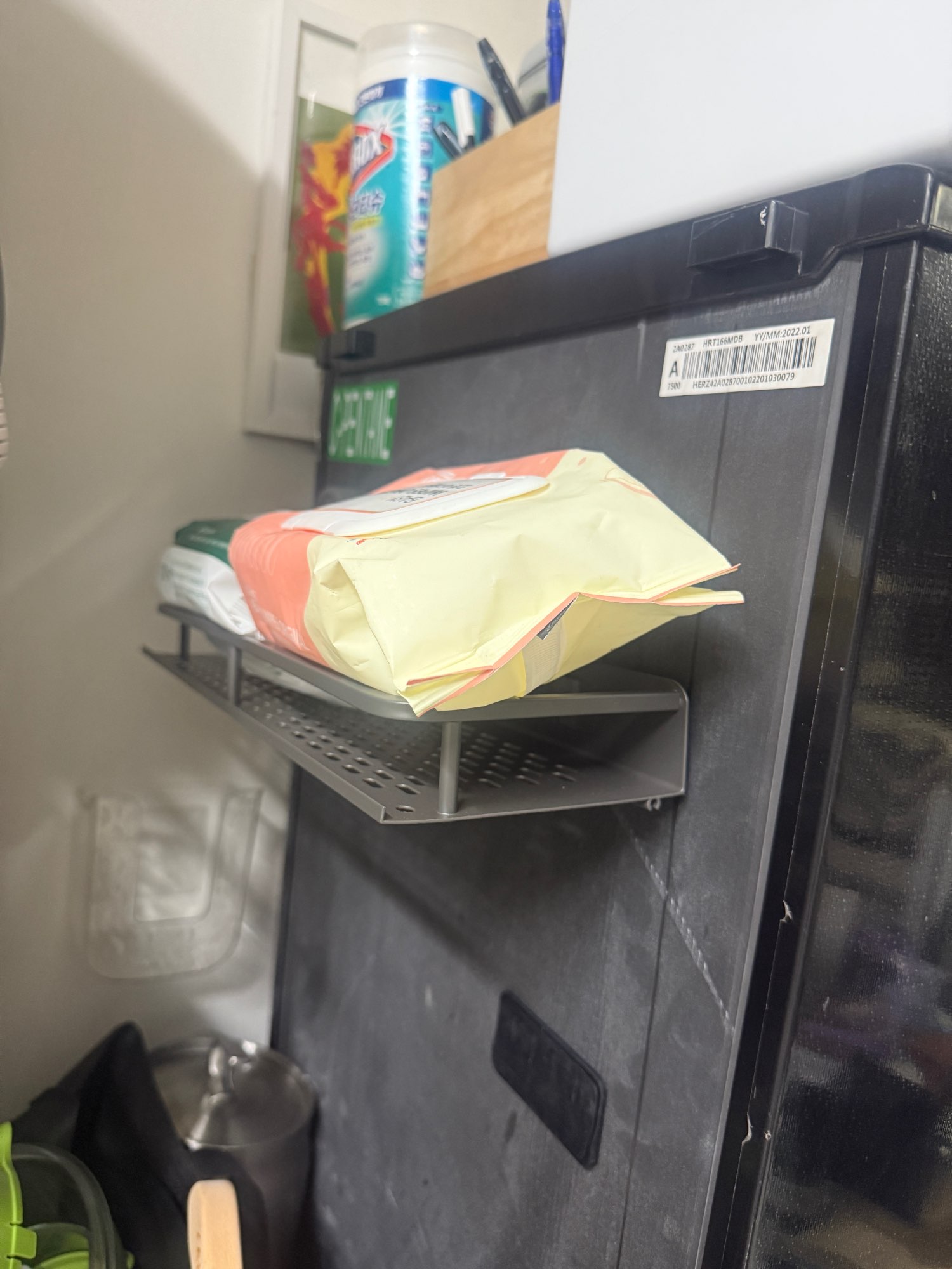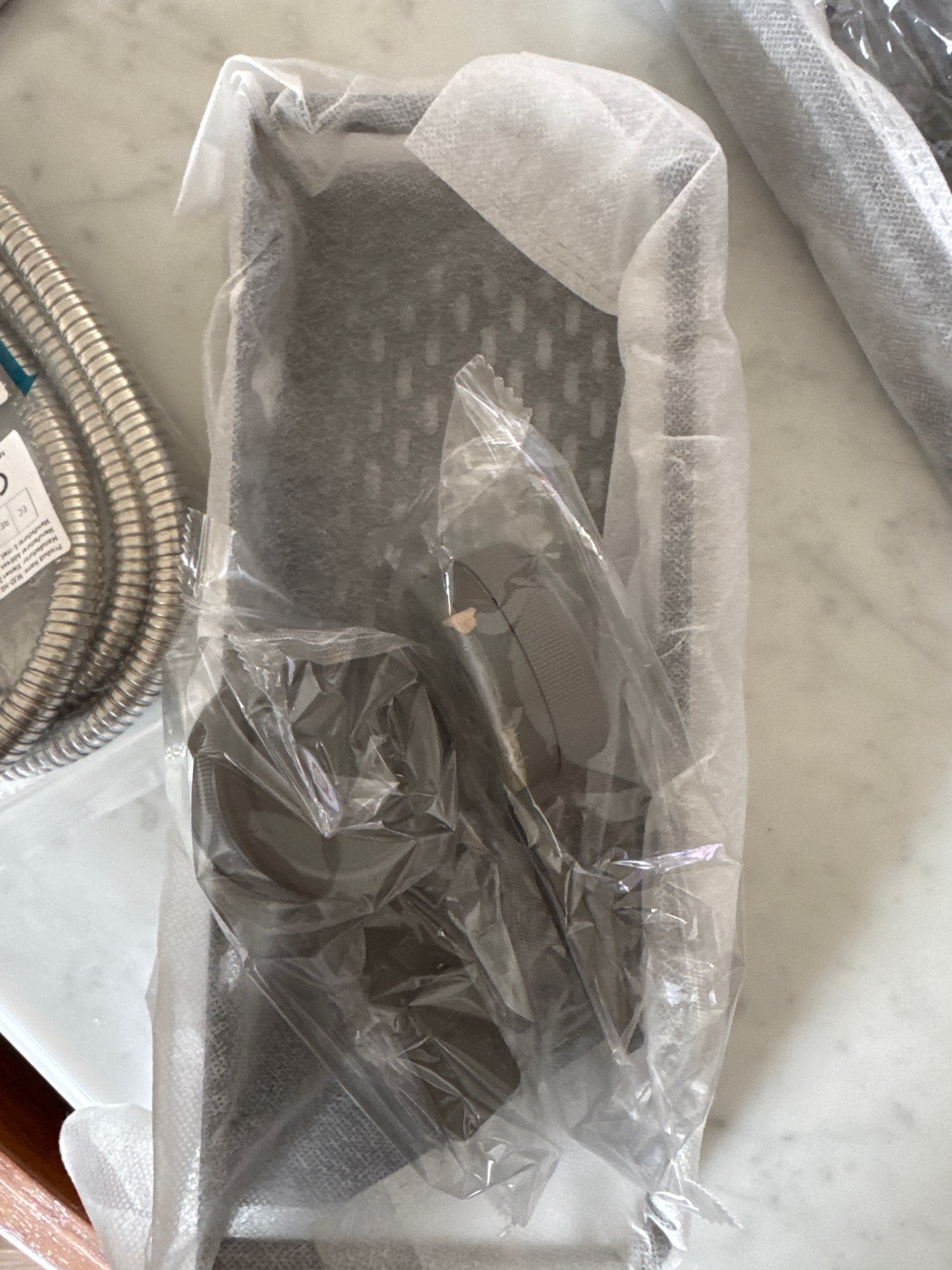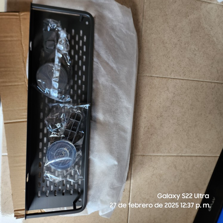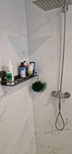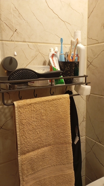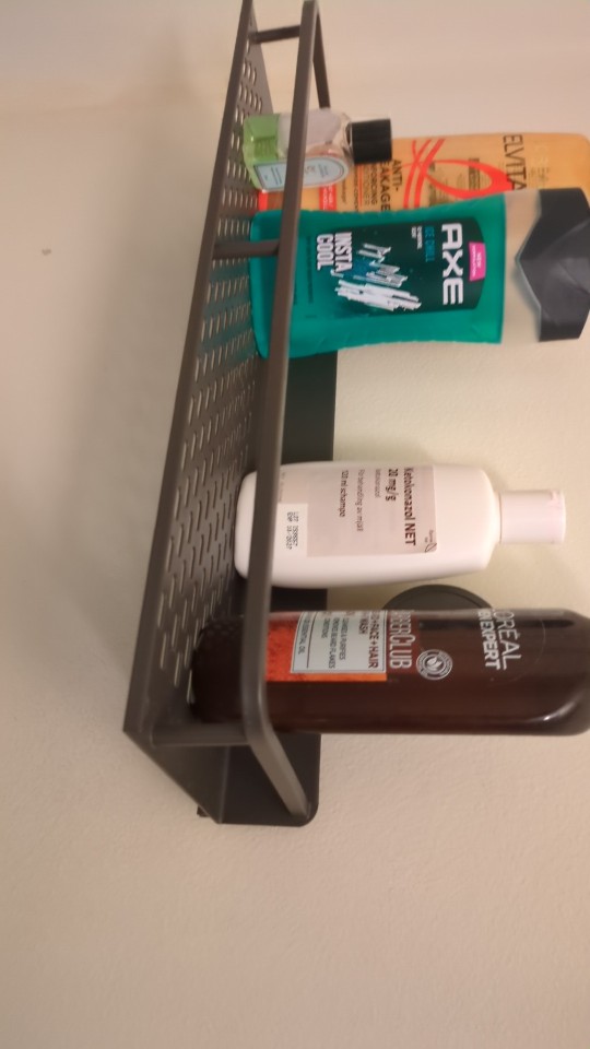 The shelf arrived quite quickly. It stuck in place and is holding well. The quality is acceptable. Overall, I am satisfied!