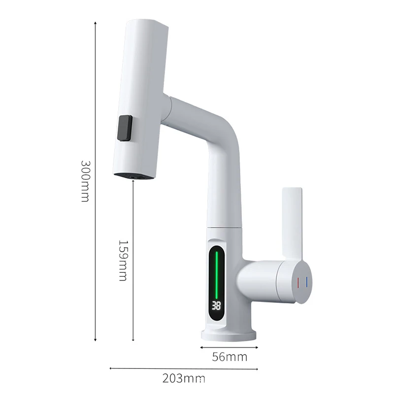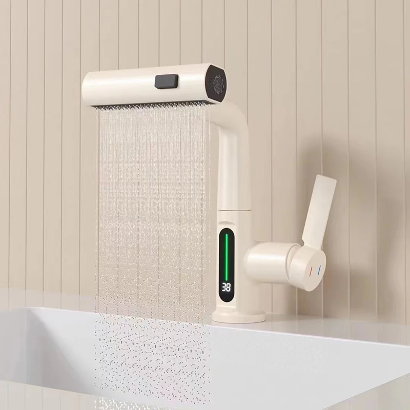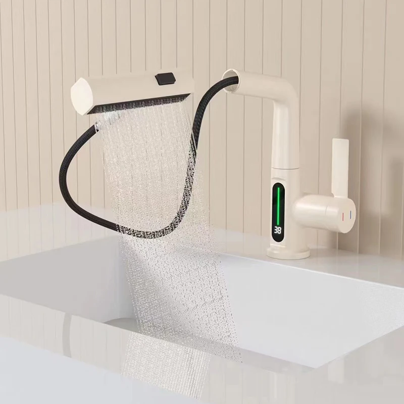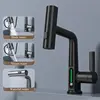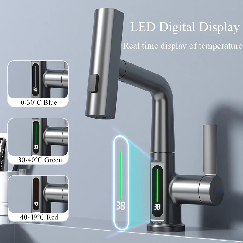 Smart Digital Display Baisn Faucet 3 Function Pull Out Waterfall Spout Deck Mount Cold Hot Water Mixer Liftable Sink Crane Tap
