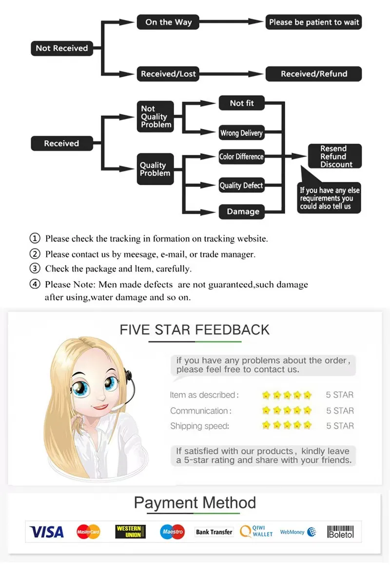 • If you did not receive the product within the guaranteed time( 45 days not including 2-5 day processing) you can request a refund or a reshipment.