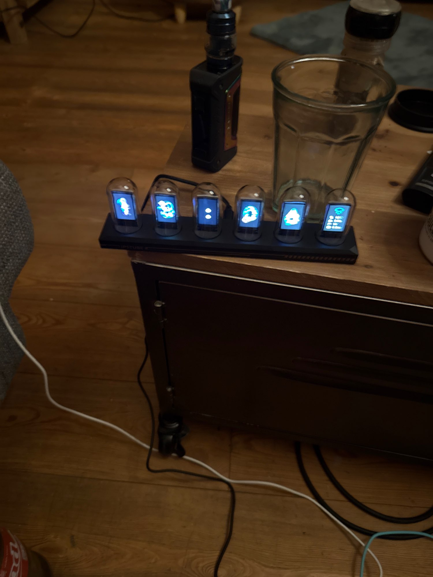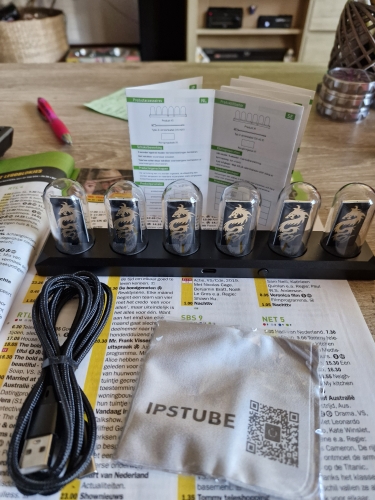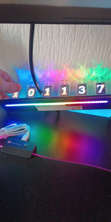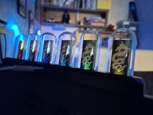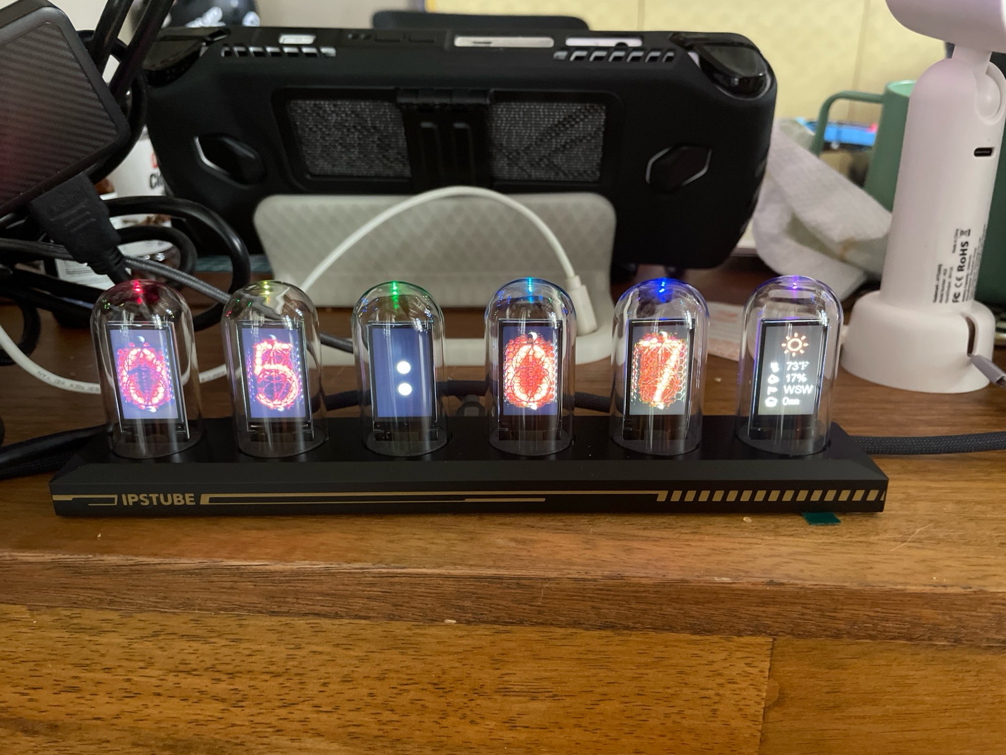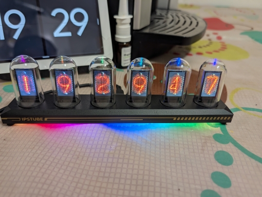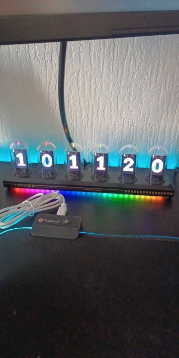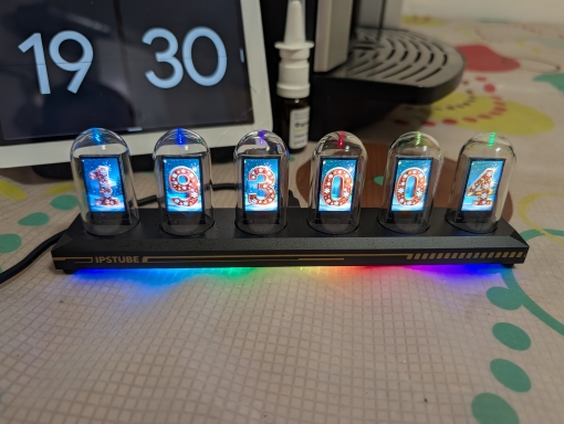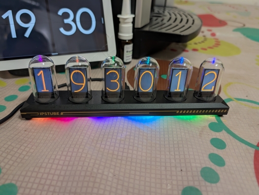 Just connect the USB cable and it becomes a vacuum tube-style clock. Since it's an IPS LCD, the power consumption is low and it's safe. I chose the LED illumination model, so the lower part is illuminated very brightly.