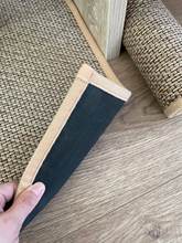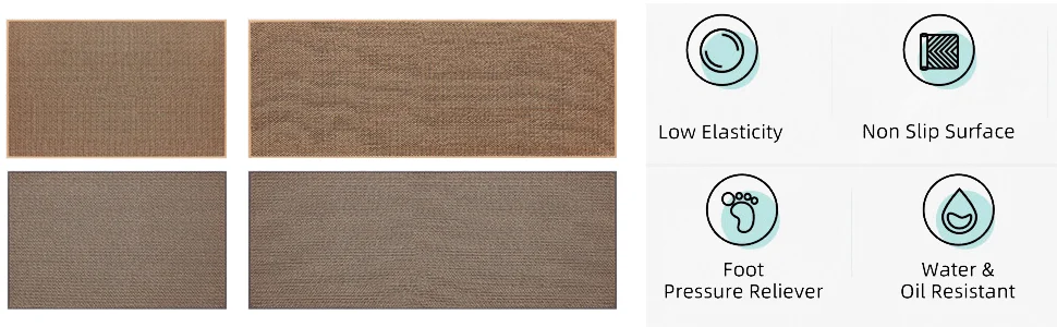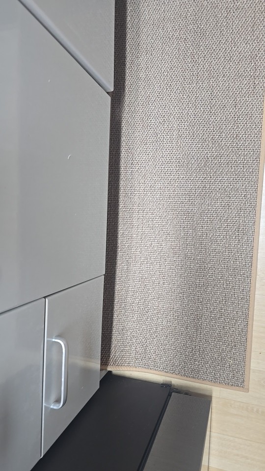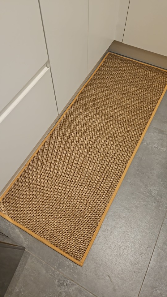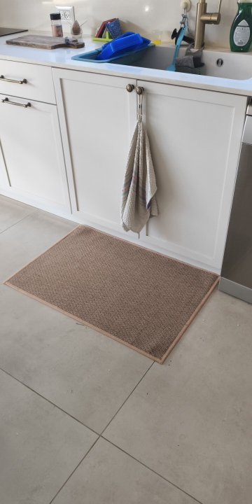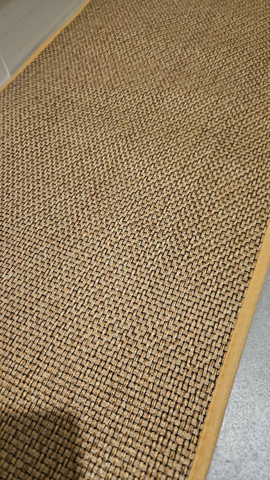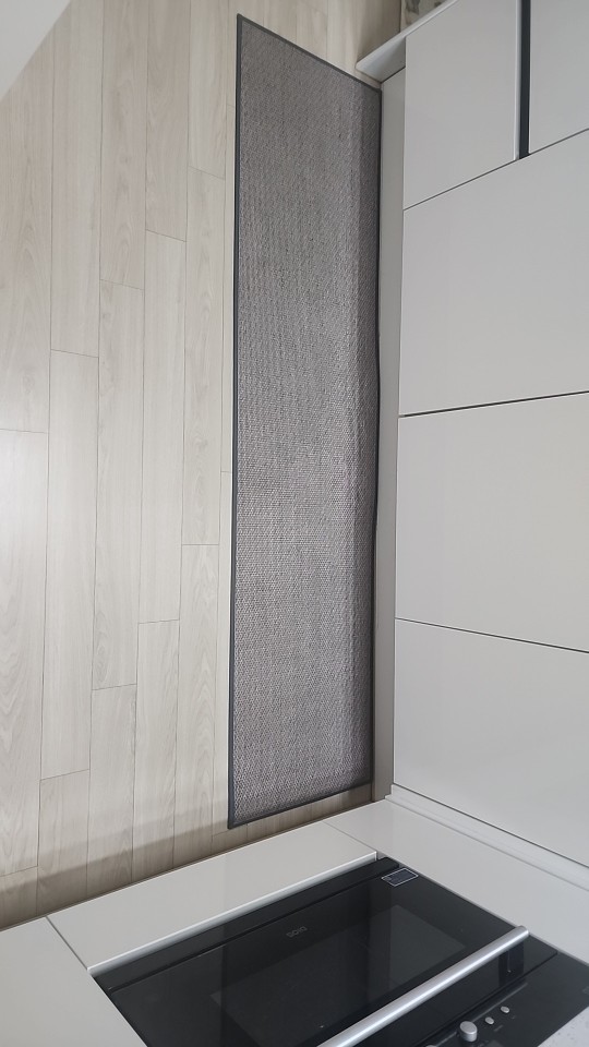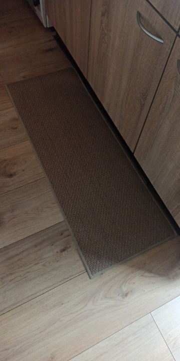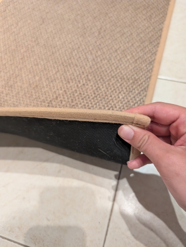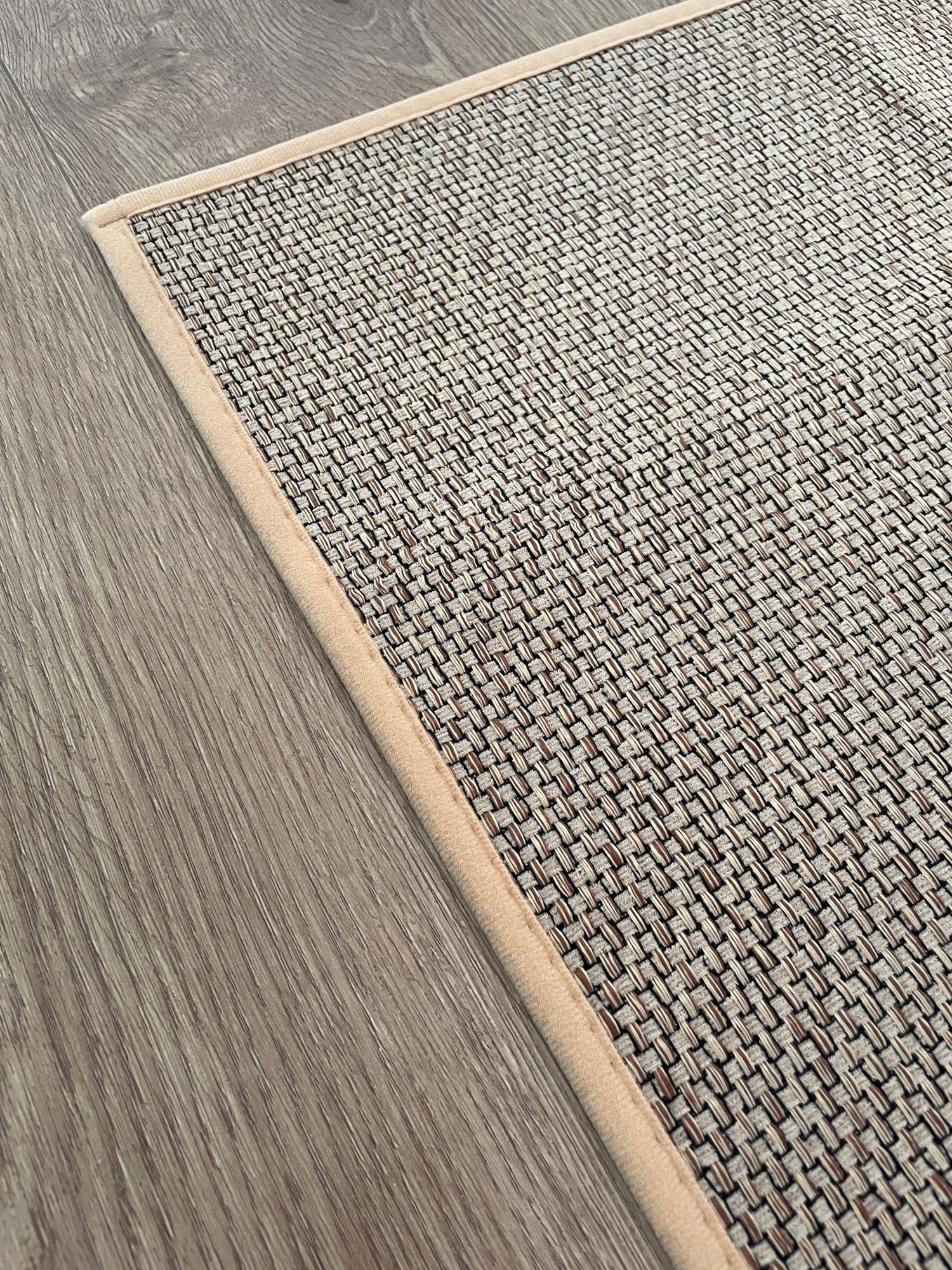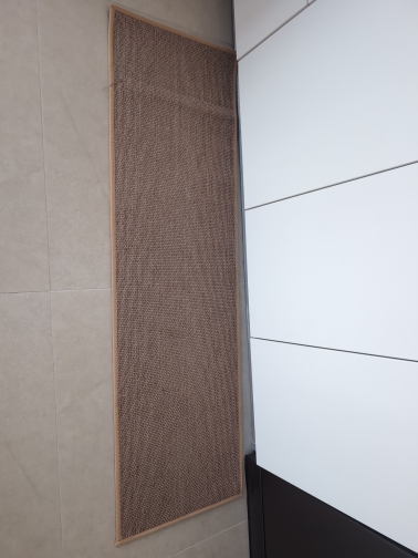 I bought two brown ones, but I received one brown and one gray one, which was disappointing. However, the texture is soft and it doesn't move around; it stays well fixed. It's like cotton fabric, so the cats thought it was a scratching post and scratched it at first. I'm very satisfied; it's neat and matches well with the wooden grain jute floor.