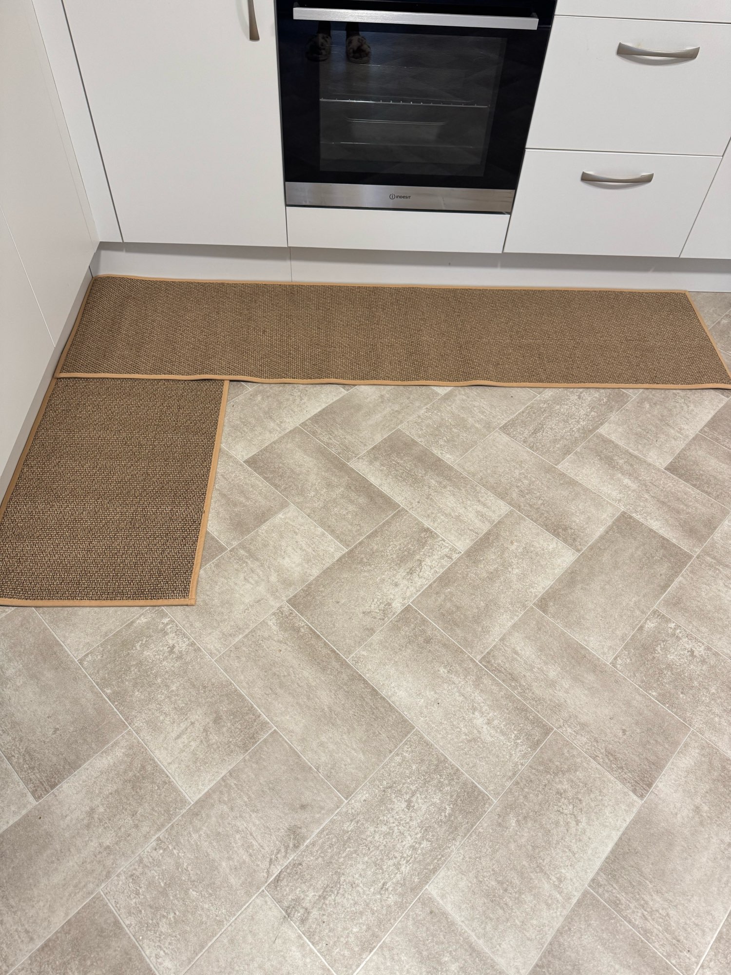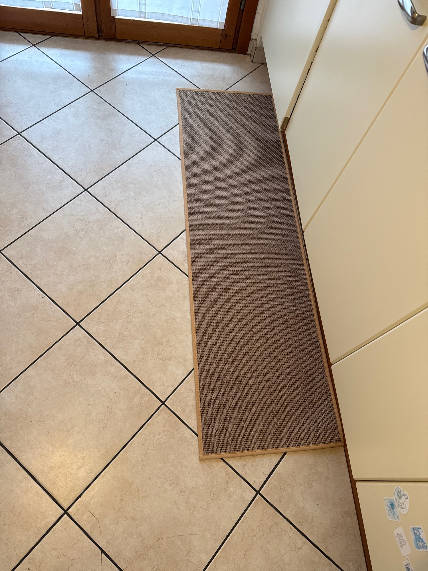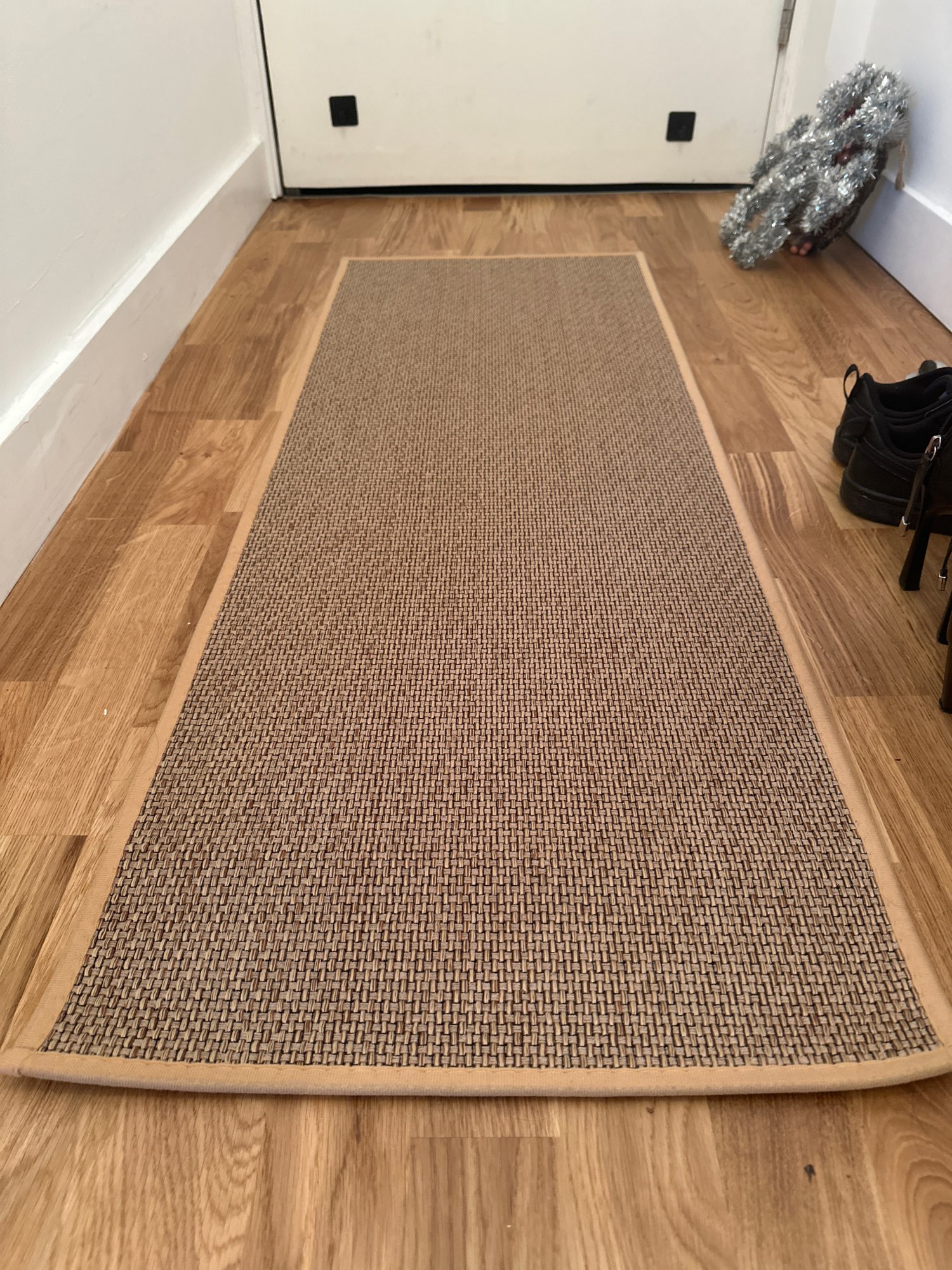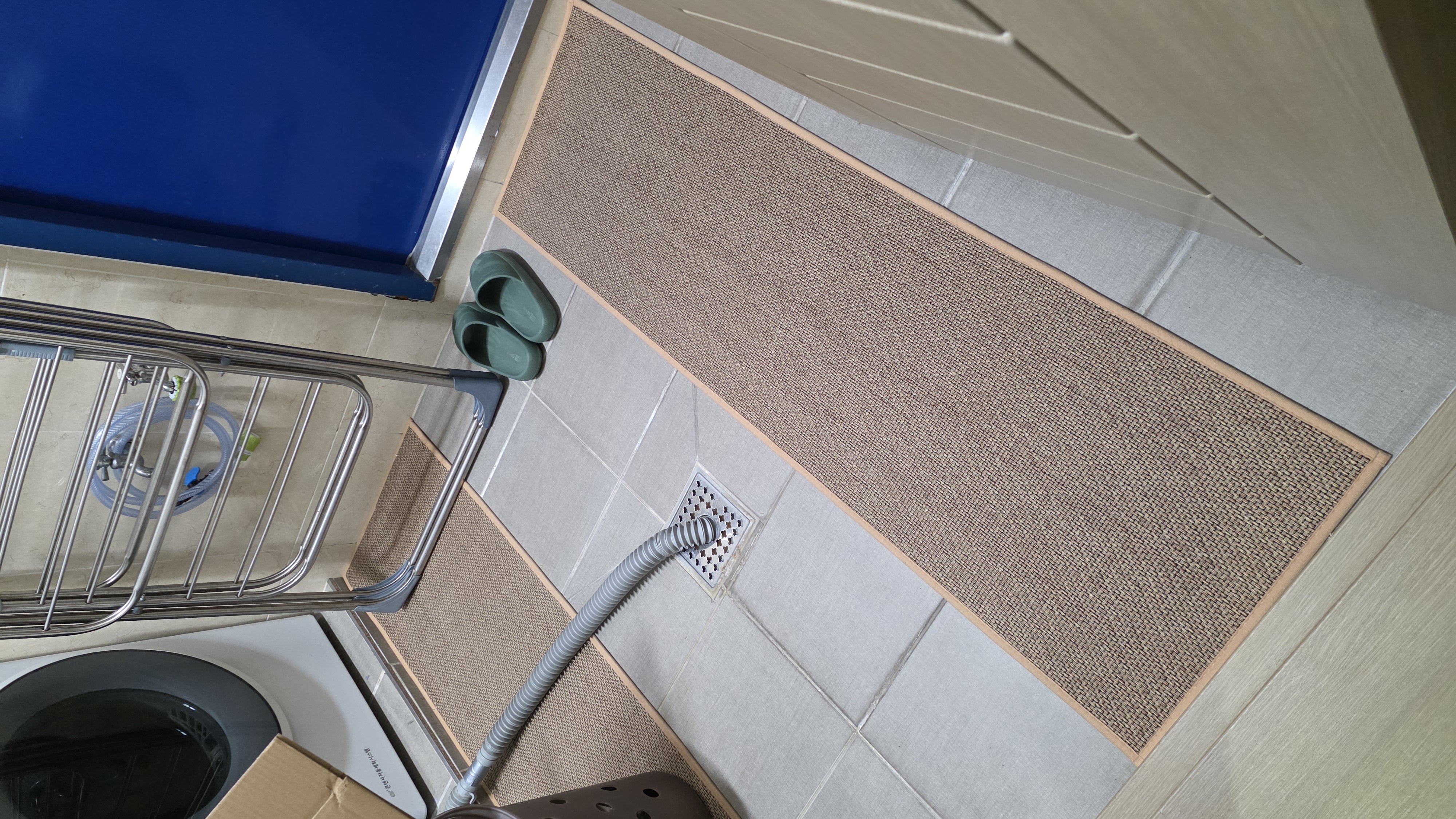 I bought two brown ones, but I received one brown and one gray one, which was disappointing. However, the texture is soft and it doesn't move around; it stays well fixed. It's like cotton fabric, so the cats thought it was a scratching post and scratched it at first. I'm very satisfied; it's neat and matches well with the wooden grain jute floor.