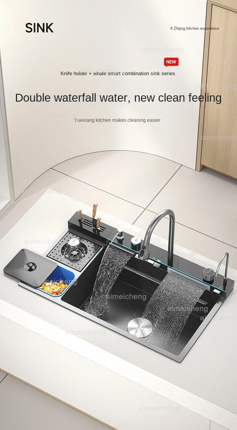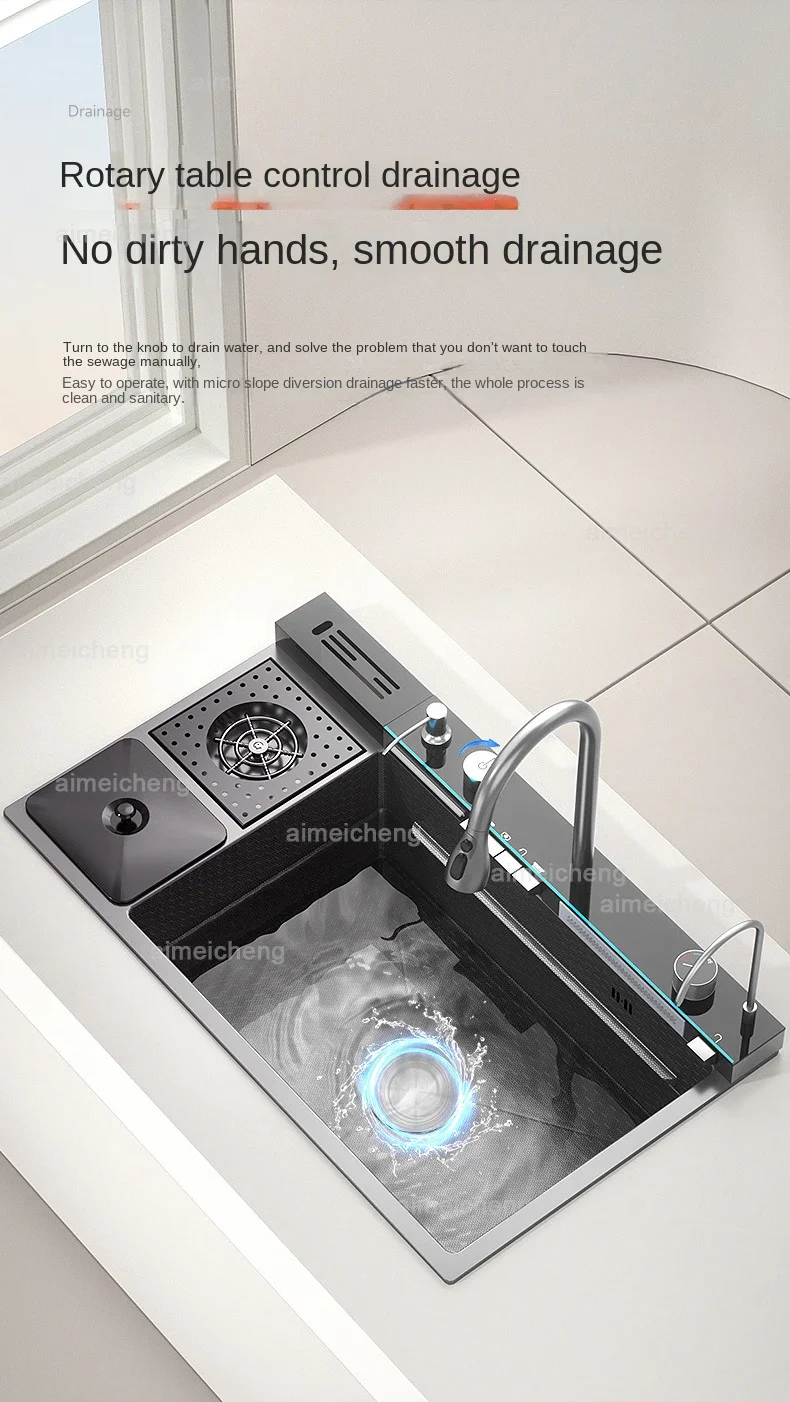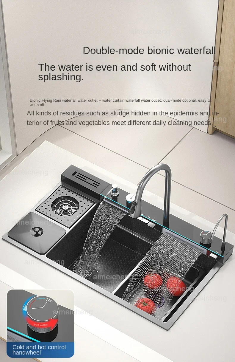 Waterfall Large Single Sink Kitchen Stainless Steel with Trash Can