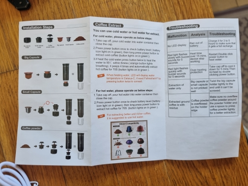 This it my third order of this product. Everything arrived in good condition and is as ordered. One full battery charge gets me 3-4 cups of hot coffee from cold water without a problem. Great for people who like to stay outdoors. It takes about 5 mins to heat the cold water and make a cup of coffee. Works great with both small and large coffee capsules.